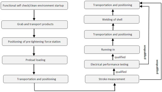 In addition to the low efficiency of manual operation, the traditional assembly process of electric valve products also has problems of low loading force accuracy and low measuring accuracy of the spool stroke. These problems led to repeated disassembly and commissioning of products during assembly. Further, the threadless structure of the valve requires fixture clamping during the whole assembly process, which results in a heavy workload in the use and maintenance of the fixture, doubling the EBW workload, and bottlenecking problems during production. To solve these, a preload loading procedure is set up separately in the automatic assembly process to improve the method of force loading and solve the accuracy problem. An improved case connection procedure solves the problem of heavy reliance on tooling and subsequent doubling of the EB welding workload during product assembly. Based on the above analysis, the designed automatic assembly process flow is as follows.