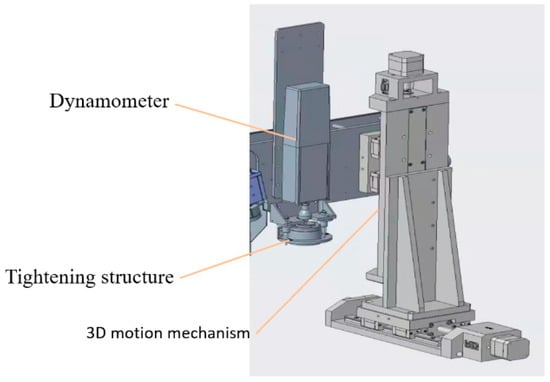 The working principle of the pre-tightening force control mechanism is to complete the preload loading through the closed loop control of the vertical displacement of the motion mechanism, the three variables of the dynamometer, and the rotating mechanism. The vertical displacement of the three-dimensional motion mechanism drives the dynamometer to press on the clamping structure of the clamping mechanism (Figure 6). When the force is reached, the rotation of the turntable of the flipping and rotating positioning structure drives the clamping structure to rotate, tightening the spring compression structure nut of the clamping mechanism to gradually lock the spring compression structure of the clamping mechanism. When the value of the dynamometer changes to 0.1N, the rotation of the turntable stops.