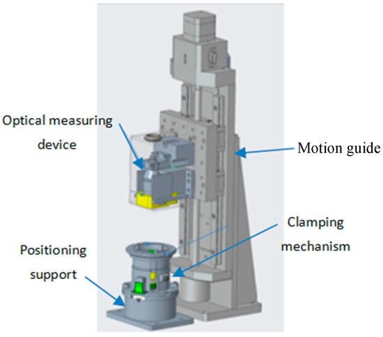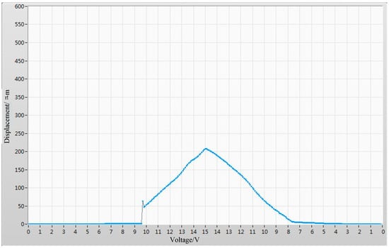 The three processes of valve core stroke measurement, electrical performance testing, and running-in are completed at the measurement and testing station. The measurement and testing mechanism consists of an optical measurement device, a motion support, and a positioning support. The process clamping mechanism (Figure 5) is used to position the valve on the positioning support, as shown in Figure 9. The optical measurement device is mainly composed of high-precision laser sensors, and its minimum test resolution is 0.1 μm. The function of the motion bracket is mainly to facilitate the installation of optical measurement devices and provide vertical movement, ensuring that the optical measurement device is within the range of the measurement stroke. The positioning support is equipped with positioning, sensor feedback interfaces, and electrical interfaces to cooperate with the position sensor and power on connector of the clamping mechanism (Figure 5) for positioning feedback and circuit continuity. The workstations of measurement, testing, and running-in processes are integrated. A set of electrical control systems using dynamic acquisition technology is developed. The laser sensor of the optical measurement device detects the position of the internal motion structure of the valve, and the control system provides voltage values at different positions to obtain the voltage and displacement curve of the valve product.