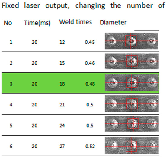 In the process of manual assembly, each set of products requires a fixture to follow the entire process. Finally, electron beam welding of the shell is carried out, and spot welding and fixation are also required through the reserved holes of the fixture. After removing the fixture, circumferential welding is carried out, thus, the welding cost and workload are doubled. Adding laser welding to the automatic assembly process can not only solve the fixation problem of valves after automatic assembly, but also reduce the high-cost electron beam welding workload by half, alleviate production bottlenecks, and save a large amount of tooling production and maintenance costs. Laser spot welding connection of the shell requires a reasonable design of welding parameters such as the current, voltage, and pulse frequency. The control of the welding point should not only be smaller than the width of the electron beam-welding seam, without affecting the appearance quality of subsequent electron beam welding, but also be able to compensate for the machining gap error and positioning error of the parts, in addition to ensuring the reliable connection of the valve during transportation and subsequent operation. This is a technical difficulty in this process. Obtained by process verification and the practical application of multiple valve products, an example welding process for connecting the shell of a certain valve product is shown in Figure 15. The welding parameter of No.3 is the optimal.