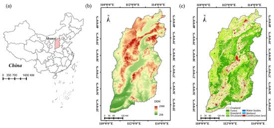 Study area location in China (a), elevation (b), and land use/land cover type of Shanxi Province (c).