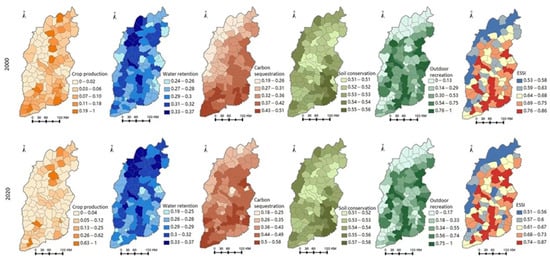 Spatial distributions of the key five ESs and ESSI across the 107 counties of Shanxi Province in 2000 and 2020.