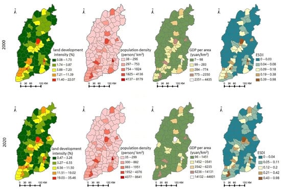 Concerning the ES demand index (ESDI), we carefully curated three indicators representing land use, population dynamics, and economic factors (Figure 4). These indicators collectively offer a comprehensive representation of ESD, encompassing preferences and requirements. We found that high values of ESDI were primarily distributed in the central Taiyuan Basin, northern Datong Basin, southern Linfen Basin and Yuncheng Basin, and southeastern Changzhi Basin, while low values were observed in the mountainous areas on the east and west sides. These basin regions, with Taiyuan, Datong, Linfen, Yuncheng, and Changzhi as their central cities, have experienced significant population and industrial concentration, resulting in high demand for ESs. Notably, the spatial pattern of ESDI closely resembles that of the degree of land use development (Figure 3). This finding is consistent with existing studies [] that indicate a strong correlation between ESDI distribution and land use development degree, population density, and per capita GDP. It is a common phenomenon in many parts of China to expand the area of construction land in order to meet social and economic needs, particularly in areas with extensive human activity []. From 2000 to 2020, the average ESDI values significantly increased in the Datong Basin, decreased in the Taiyuan Basin and Yuncheng Basin, and the disparity in ESD values among the counties within these basins significantly decreased. Additionally, ESDI levels in Taiyuan city and Changzhi city district, which had the highest ESDI values in the whole study area, remained relatively stable between 2000 and 2020. This stability can be attributed to the slower economic and population growth in Taiyuan and Changzhi, reaching a stable socio-economic agglomeration state within Shanxi Province []. Overall, Shanxi Province exhibits clear spatial mismatch characteristics between ESS and ESD.
