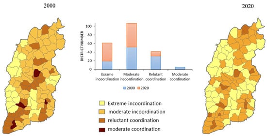 The coupling coordination degree between ES supply and demand of Shanxi Province in 2000 and 2020.