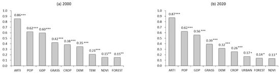 Factor-detected results of socio-ecological variables of CCD using GDM in 2000 (a) and 2020 (b). “***” p < 0.001, “**” p < 0.01, “*” p < 0.05. Panels (a) and (b) display the prominent influencing factors of CCD in 2000 and 2020, respectively. All factors are organized in descending order based on their influencing coefficients (q-statistic values).