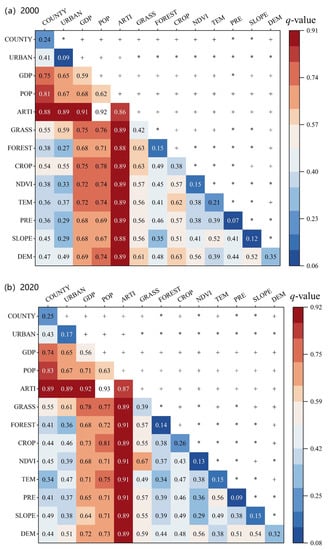 The GDM was utilized to identify the most influential socio-ecological drivers for the coupling coordination between ES supply and demand. The factor detection results for thirteen socio-ecological variables yielded the influencing coefficients (q-statistic values) and significance levels (p-values) (Figure 6).