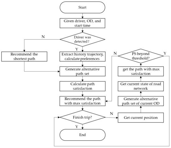 In recent years, China witnessed rapid urbanization, leading to the expansion of urban areas and significant advancements in urban road construction. However, the increasing number of motor vehicles outpaced the provision of urban road infrastructure, resulting in severe traffic congestion issues [1]. For instance, in Guangzhou, the number of motor vehicles reached 3.309 million (increased by 7.4%) in 2021 [2]; however, the total road length in the city was 11,464 km, which only increased by 31 km (or 0.3%) [3]. The fundamental problem underlying traffic congestion is the mismatch between traffic supply and demand, in terms of both time and space. Therefore, to address traffic congestion, it is necessary to consider solutions from both the supply [4,5] and demand sides [6,7]. While increasing the traffic supply can be achieved through expanding the length and density of roads, it cannot provide immediate relief. Furthermore, such measures are constrained by the urban layout, traffic structure, and land uses. Therefore, at present, managing traffic demand is crucial for tackling urban congestion. One key aspect in this line is providing personalized path recommendations that cater to individual travel preferences, which can play a pivotal role in balancing the spatial and temporal distribution of travel demand, thereby enhancing traveler satisfaction, enriching ways of traffic management, alleviating traffic congestion, and improving urban traffic efficiency.