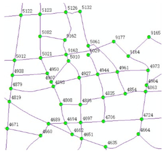 In other words, the turning value is assigned as follows: 1 for straight ahead, 2 for a right turn, 3 for a left turn, and 4 for a U-turn. In this paper, the turns were calculated based on the road network information. They were recorded as and , where represents the north deviation angle between the direction of traffic and the north direction (clockwise direction is positive) when entering the intersection or exiting the road, while represents the north deviation angle when entering the road or exiting the intersection. The north deviation angle falls within the value range of . The upstream section, denoted by , represents the direction of travel from into the intersection. On the other hand, represents the direction of travel from the intersection into the downstream . The turning angle, denoted as , is calculated as follows: