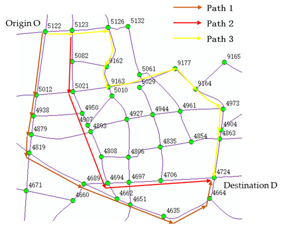 Before introducing the properties, we defined path as a sequence of road segments from the origin to the destination. Thus, the path can be expressed as follows: , where represents a road segment.