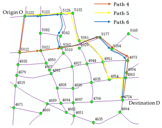 The above graphs illustrate selected results for secondary path recommendations from node 5122 and at node 4879 during the time period of 7:00–9:00 on a single day. Based on Equation (30), the chosen threshold for secondary path recommendations in this study was 10%. Therefore, among drivers e, f, and g, only driver e received a secondary path recommendation, resulting in a 42.17% increase in satisfaction. It is worth noting that, for this driver, among the underlying index factors—including path travel time (0.103), path length (0.133), number of path lanes (0.148), path turning coefficient (0.127), number of path intersections (0.128), average path density (0.102), maximum path density (0.115), and historical path similarity (0.144)—historical path similarity carried the highest weight and exerted the most significant influence on the driver. The new suggested path was entirely different from the original path, with a similarity value of 0. Normally, a completely different path should not be recommended. However, through numerical calculations and analysis, it was found that the new path (Path 5) exhibited a significant decrease in maximum path density when compared to the original planned path (Path 7), as well as a lower number of intersections, resulting in a substantial increase in satisfaction. This result demonstrates the necessity and feasibility of quantitative analysis of these indicators.