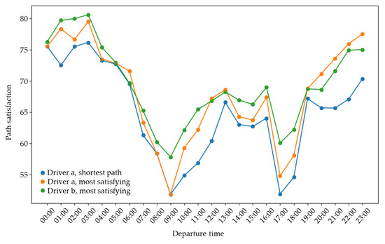 Traffic conditions are subject to time-dependent changes, and the dynamic attributes of a path are closely associated with these conditions. Consequently, the perception of path satisfaction is influenced by these variations, leading to changes in the recommended paths over time. Taking driver a as an example, we recommended different paths at various departure times throughout the day, assessing their respective satisfaction levels. Additionally, we included the satisfaction of the shortest path at different departure times for comparison purposes. The results of the path recommendations are presented in Figure 11.
