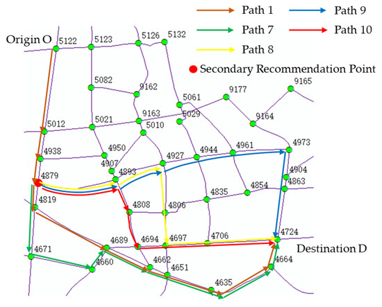 Considering that the traffic conditions in a road network might change, it may become necessary to provide drivers with secondary path recommendations while they are already en route. Figure 12 exemplifies this scenario, taking Path 1 as an example, where drivers were offered secondary path recommendations. As node 4819 experienced significant daily traffic flow, the secondary path recommendation focused on its upstream node (node 4879). Prior to reaching node 4879, the new starting point was set at this node, while keeping the end node unchanged. Separate calculations were then performed to assess the path satisfaction from node 4879 to the end of the originally planned path and for the satisfaction with the newly recommended path. Table 25 presents some of the secondary path recommendation results, where “Change in Satisfaction” denotes the variation in the satisfaction compared to the actual path. The path numbers in the table correspond to those indicated in Figure 12.
