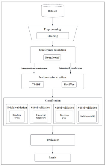 We worked with two versions of the dataset: one with and one without coreference resolution. These two versions were used separately for the next steps of creating the word vector models. We considered using the TF–IDF and Doc2Vec techniques to create the input vector for classification. The vectors were subsequently used as an input for the following classification algorithms: Decision Tree, Random Forest, MultinomialNB, K-Nearest Neighbors, and Logistic Regression. The individual steps of our methodology are depicted in Figure 2.