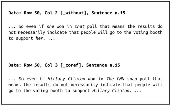 Steps 2 and 3 are the important parts of the mentioned methodology. In step 2, a new text data file named “_coref” is created, where mentions from the original text data file “_without” are identified and replaced (Figure 3). Then, word vectors are created from both the “_without” and “_coref” data files using both the TF–IDF and Doc2Vec methods.