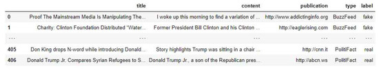 We used the freely available dataset KaiDMML, which was originally created for the needs of the FakeNewsTracker system [19,20]. The dataset contains records collected from the PolitiFact and GossipCop projects. On Figure 4, a sample of the used dataset is presented.
