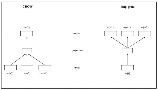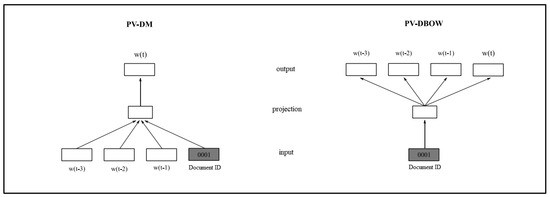 Another Doc2Vec method is PV–DBOW (distributed bag of words of paragraph vector), which ignores the context of words in the input. It is less memory-demanding than the PV–DM technique, and it is very similar to the Skip-gram algorithm from Word2Vec [39]. The architecture of both algorithms is shown in Figure 6.