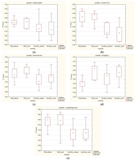 Simultaneously, we also analyzed the results from the F1 score point of view (Figure 8a–d), which combines precision and recall. Even in this case, higher median values were observed for all F1 score metrics except for word embedding with Doc2Vec and the MultinomialNB classifier.
