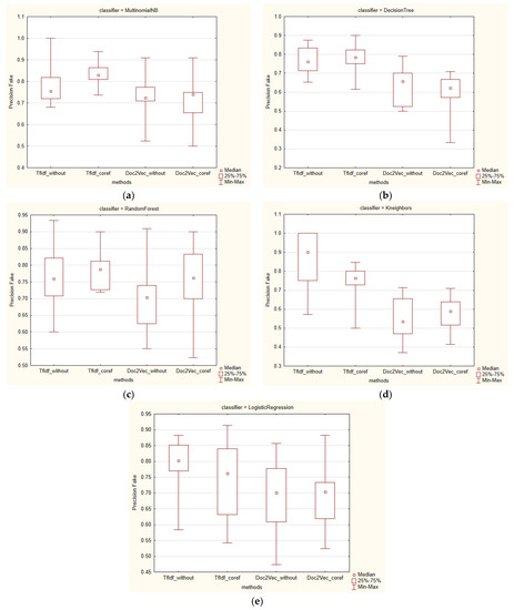 All the methods were applied with the aim of identifying fake news. For this reason, we present the results (Figure 9a–d) for the performance measure precision_fake.