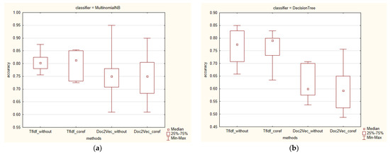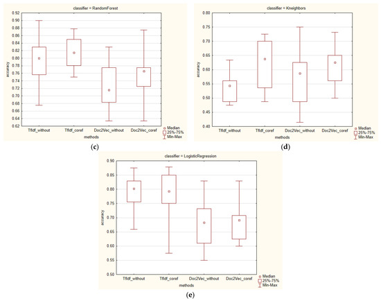 Therefore, we analyzed the results for the used classification algorithms individually in more detail. The results of the 10-fold cross-validation for each classification technique (Decision Tree, Random Forest, K-Nearest Neighbors, MultinomialNB, and Logistic Regression) depended on the methods of preparing the input vectors for the classification methods. The input vectors were prepared without coreference resolution (parameter _without) and with coreference resolution (parameter _coref). At the same time, two word-embedding methods (TF–IDF and Doc2Vec) were applied for the preparation of the vectors.