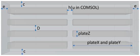 Figure 1 shows the basic geometry and parameter definitions used in the simulations. The overall bulk material (outer rectangular prism) and alternating pairs of electrode chambers (inner rectangular prisms) were situated in parallel within the material [26]. The structures were joined together using the union function. Tendon thicknesses e (at device edges) and h (between fibers) were locked to be equal and swept together between 100 and 200 µm, in steps of 10 µm. Top and bottom edge thickness c was set to 100 µm. The non-flexed lateral widths (plateX, plateY) of micro capacitor plates were set equal to 1000 µm. The non-flexed plate thickness (plateZ) and plate distance D were set equal to 100 µm. Silicone (polydimethylsiloxane (PDMS)) was assigned to the bulk dielectric. Liquid water was assigned to the electrode chambers [25].