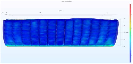 To set up the simulations, three physics nodes were used: electrostatics, solid mechanics, and moving mesh set to “normal”. The solid mechanics node was applied to the bulk dielectric. The moving mesh node was applied to the electrode chambers for efficient computation in finite element analysis applications [27]. The electrostatics node was applied to all domains. Within the electrostatic node, a potential of 3000 V was applied to all surfaces of one set of electrodes and a ground potential was applied to all surfaces of the other set of electrodes. This choice was made for consistency with the previous work [25]. This voltage also ensures that even if the electrostatically induced deformation would shrink the distance between the plates of the micro capacitor, the resulting field would still be well-below the typical dielectric breach value of several hundred volts per micron.