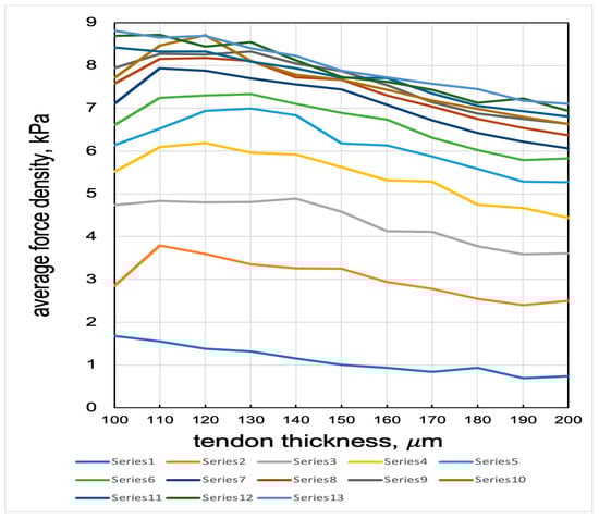 For each N from 1 to 13, a series of simulations swept the tendon width from 100 to 200 µm, in 10 µm steps, to determine the maximal force density.