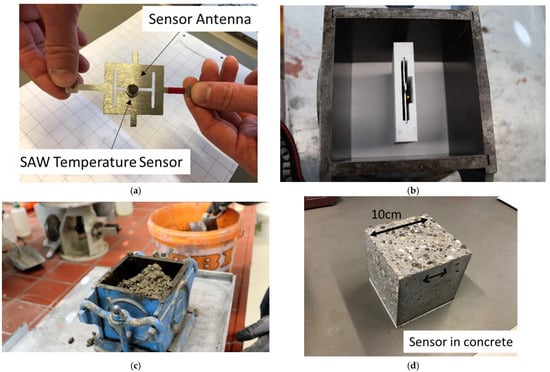 Integration of a 2.45 GHz sensideon SAW ID-Tag sensor in concrete: (a) SAW ID-Tag with its antenna; (b) sensor and protecting housing, in formwork, prior to casting; (c) casting and shaking of concrete, to ensure proper concrete compaction; (d) concrete cube, with embedded sensor.