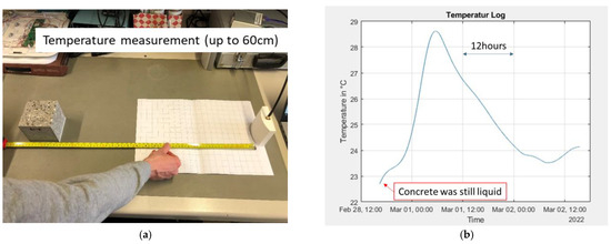 In situ temperature measurement in a small concrete block: (a) Maximum interrogation distance, at the end of the solidification (maturation) phase; (b) temperature data, over time, during solidification phase (data were acquired between 28 February and 2 March 2022).
