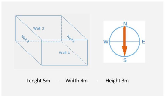 In the following section, we use a numerical study to illustrate the stabilizing effect of PCM panels in a typical residential room in Villach, southern Austria (see Figure 5). Real climatic data were used for this study. The software tool PCMexpress 1.0.3 was used for the computations (Valentin Software GmbH, www.valentin-software.com, accessed on 10 August 2023). In the simulation model, PCM panels cover the entire ceiling. In some of the simulations, they also cover the entire wall surface. Alba Balance 25 solid gypsum boards (ABG) were selected as PCM. The main technical characteristics of these PCM panels are shown in Table 1. The construction of the walls plays a major role, as it obviously influences the thermal capacity and conductivity of the walls, and therefore the heating/cooling demand. In our case, a simple construction (i.e., elevated/suspended reinforced concrete with 25 mm ABG) was selected.
