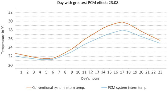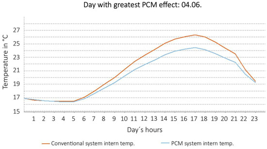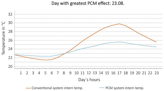 Four different configurations were simulated: PCM in ceiling + manual ventilation (windows); PCM in ceiling + mechanical ventilation; PCM in ceiling and on the walls + manual ventilation; PCM in ceiling and on the walls + mechanical ventilation. For each configuration, we have calculated the effect of the PCM material, considering actual average climate data, in Villach. The simulation results are shown in Figure 6, Figure 7, Figure 8 and Figure 9. In each figure, the red curve shows the expected temperature profile inside the room without PCM. The blue curve shows the expected temperature profile with PCM (during the day of the year when the effect of the PCM would have been maximum).