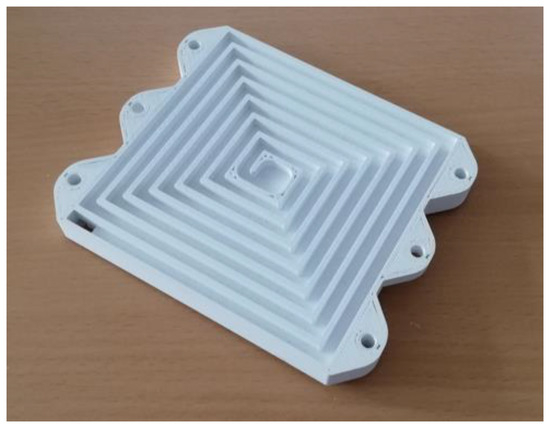 Figure 11 shows the results of a feasibility study carried out in this field. A sensideon SAW ID-Tag sensor and its 3D-printed holder (see Figure 11a) were placed directly into a hollow, 15 cm × 15 cm × 15 cm concrete cube (Figure 11b), subsequently filled with PCM material in granulated form (Figure 11c). The walls are 2.5 cm thick. The phase transition temperature of the used PCM lies between 45 and 50 °C. The cube was then placed in a climatic chamber with the temperature set at 65 °C (the air within the chamber reaches this temperature within a few minutes). The heating was then turned off after 20 h. The experimental curve in Figure 11d shows the evolution of the temperature at the heart of the cube, obtained wirelessly and without embedded electronics, using the SAW sensor. The plateaus observed in the temperature rise and fall phases are due to the phase change of the PCM material. The PCM stabilizes the temperature in both directions. These results demonstrate the technical feasibility of the concept discussed in this paragraph and offer interesting prospects for applications.