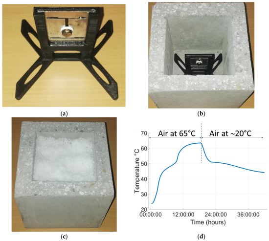 Integration of a sensideon SAW ID-Tag sensor in a hollow concrete cube, filled with PCM granulates: (a) SAW ID-Tag with its 3D-printed support; (b) sensor and support within the cube; (c) cube filled with PCM granulates; (d) temperature evolution within the PCM material, measured with the SAW sensor. The cube was placed in a climatic chamber with a set temperature of 65 °C. The reader’s antenna was also placed in the climate chamber approximately ten centimeters away from the cube’s surface. After 20 h, the temperature inside the climate chamber was set to 20 °C.