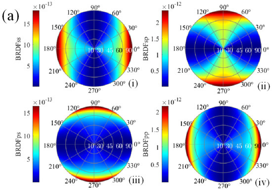 The BRDFss (i), BRDFsp (ii), BRDFps (iii), and BRDFpp (iv) of surface dirty particles at (a) and (b).