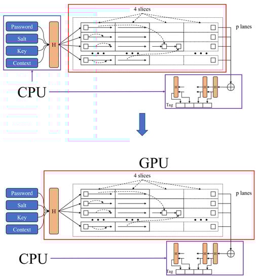 To solve these issues, we propose a new technique that processes both stages—‘init’ and ‘fill memory blocks’—on the GPU, aiming to handle multiple passwords. By doing this, the amount of data transferred to the GPU is significantly less than that of the data after initialization in the previous implementation. This reduces the delay in data transfer from the CPU to the GPU. The same reduction applies to the ‘final’ stage.