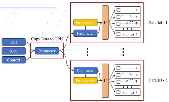 By leveraging GPUs for parallel optimization implementation, it is possible to handle different input values in parallel during a brute-force attack. This means that the high parallel processing capabilities of GPUs can be utilized to compute multiple input values simultaneously and produce results. Utilizing the parallel processing capabilities of GPUs can enhance the speed and efficiency of brute-force attacks, enabling faster and more effective decryption of passwords. Such techniques are considered crucial research topics in the fields of password decryption and security, attracting interest from both attackers and defenders. Due to its specialization in parallel processing, GPUs can effectively utilize the parallel optimization implementation of the ‘init’ stage in Argon2. If the H function computation is performed on the CPU, it would require generating individual initial blocks for each different input. However, by performing the computation on the GPU, the same operation can be applied to all inputs, enabling the generation of initial blocks in a single computation. This allows for the efficient utilization of the GPU’s parallel processing capabilities, resulting in a more efficient implementation of the ‘init’ stage in Argon2. In the case where the parameters other than the input password are the same, as depicted in Figure 4, only the parameter information is transmitted and each thread can perform the hashing operation for different passwords.