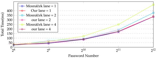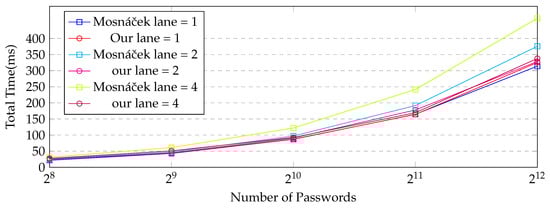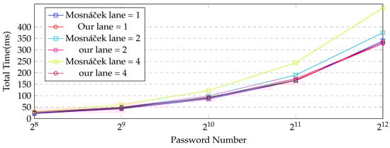 Figure 5 and Table 2, Table 3 and Table 4 compare the performance of our implementation with that of the previous one at the parallelism levels (p) of 1, 2, and 4 for the Argon2d id version. The relationship between the Number of Passwords and Total Time (ms) was compared. As seen in Figure 6, overall, the time approximately doubles each time the number of passwords doubles. The increase in time decreases as the number of passwords being processed increases. As illustrated in Table 1, the time per password decreases as the number of passwords increases. This is most prominent in GPU computation. When processing 4096 passwords, it deals with 128 times more passwords than when processing 32 but the computation time increases by about 25 times. This confirms that more efficient operations are possible when there are more passwords processed in parallel on the GPU. However, it is relatively inefficient in terms of data transfer time between the CPU and GPU. The greatest delay in GPU computation was confirmed to be the data transfer time between the CPU and the GPU. Generally, our implementation has a shorter processing time than the existing implementation. It was more efficient when there were more passwords being processed and when the level of parallelism was higher. The increase in the level of parallelism affected the delay in data transfer between the CPU and GPU. In the case of the existing implementation, computation was somewhat reduced but, in our implementation, the time taken increased when the number of passwords was large (more than 1024). The difference between the two implementations was not significant at a parallelism level of 1 but, as the level of parallelism increased, the performance difference became more significant and the difference increased as the number of passwords increased. In our work, as the fillblock operation and finalize operation run on the GPU, the amount of memory transfer between the CPU and GPU is reduced, and the computation time in the kernel increased. Therefore, although the computation was more efficient in the existing implementation, the overall time was reduced by reducing the larger delay factor, the data transfer time between the CPU and the GPU. These characteristics were the same in the i version and d version, as shown in Figure 6 and Figure 7, and Table 5, Table 6, Table 7, Table 8, Table 9 and Table 10.