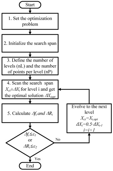 The center point is chosen and specifies the search span for determining the search region. The maximum number of search levels and the number of search points per level is defined. In each search level, i is stored and the optimal solution and the location of the optimal solution in that level are stored after scanning the number of search points. Finally, the termination conditions are checked if or , where