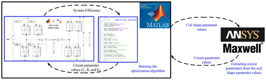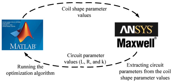Step (3) Interfacing MATLAB with ANSYS Maxwell: To calculate the objective function, the coil shape parameter values and the circuit parameter values are exchanged between MATLAB and ANSYS Maxwell, as shown in Figure 5. This process can be automated by interfacing interface MATLAB with ANSYS Maxwell using the script. MATLAB should compute PTE and run the optimization algorithm and ANSYS Maxwell extracts the circuit parameter values such as the inductance, resistance, and coupling coefficient by analyzing the coil in design. To automatically implement this process, the script function of ANSYS Maxwell is internally called MATLAB script.