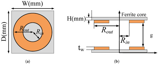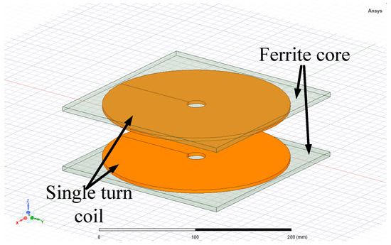 where k is the coupling coefficient, Q is the quality factor of the coil and is the ratio between of equivalent load resistor and coil parasitic resistance. Coil modeling in ANSYS Maxwell is generated as a single-turn coil as shown in Figure 9, and the coil size and ferrite core size are adjusted within the design constraints. In addition, when using a single-layer circular coil, wire diameter is assumed to be equal to the coil thickness . The coil is made of about mm diameter Litz wire with 500 strands of mm thickness. Therefore, is around mm. The Litz wire information is updated in ANSYS Maxwell by the number of conductors in the coil cross-section.