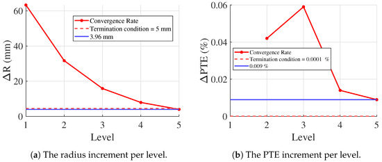 Convergence rate of (a) the radius increment per level (b) the PTE increment per level.