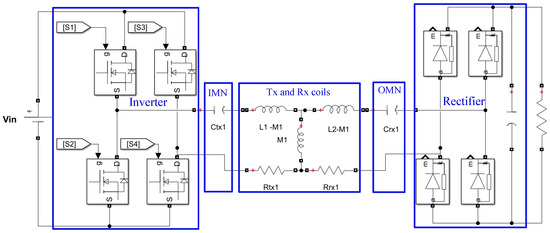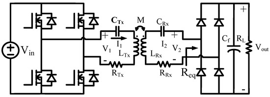 Wireless power transfer technology has recently become widely used in a variety of applications. Inductive power transfer (IPT) in Figure 1 utilizes electro-magnetic coupling that has a low coupling coefficient and thus a high leakage inductance [1,2,3]. For this reason, it is difficult to achieve a high power transfer efficiency (PTE) when the transmitter () and receiver () coils are directly connected to the circuit and compensation circuits are connected to each of the and coils to make an impedance compensation [4]. Therefore, it is important to design the and coils to maximize the PTE considering the compensation circuit along with the coil geometric parameters.