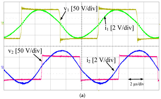 According to the proposed design in Section 4.3, , , and N values in the proposed coil design approach are set equal to 173 mm, 139 mm, and 10, respectively, as shown in Figure 17. Table 6 and Table 7 summarize the FEA and measured results, as well as the capacitance results. Table 8 summarizes the experimental results. The , , and values are determined following the IPT system design specifications. The efficiency is measured when the system is operated at resonance frequency where the current and voltage phases are in phase as shown in Figure 18. The proposed coil design method shows higher efficiency than the conventional coil design method by %. Furthermore, the proposed method has fewer FEA executions than the conventional method.