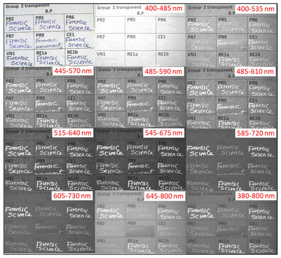Group II ink samples showed a neutral appearance and seemed transparent under the first 400–485 nm band-pass filter. Group II contained nine samples, namely PR2, PR5, PR6, PR7, PR9, CE1, VN1, RE1a, and RE1b. All Group II samples showed a bright white color using the different excitation filters as shown in Figure 2. Starting from the eighth 585–720 nm band-pass filter, the IRL of the samples PR5, PR7, PR9, CE1, and VN1 begin to decrease while the remaining other samples still possess a strong IRL, suggesting differences in the dye constituents. This shows the capability of using longer-wavelength excitation filters to discriminate ink samples [26].