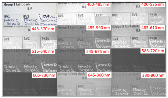 The VSC studies were conducted using a VSC 6000 workstation (Foster & Freeman Ltd., Evesham, UK) featuring an advanced digital system suitable for comprehensive forensic examination of a variety of questioned documents. The sophisticated VSC 6000 workstation incorporates a digital imaging system, variable light sources, and multi-spectral illumination spanning different regions of ultraviolet, visible, and infrared light. Notably, the VSC 6000 includes a high-resolution micro-spectrometer, which facilitates the non-destructive spectral analysis helpful for studying distinct features of ink and paper compositions. The VSC 6000 system allows the acquisition of absorption, reflectance, fluorescence, and transmitted spectra from the documents under scrutiny. Such advanced optical and spectroscopic capabilities enable using the VSC 6000 for a wide range of document examinations, encompassing both ink and paper analysis. The VSC 6000 features spot luminescence examination capability, allowing images to be illuminated with visible light of different wavelengths, and then the luminescence is recorded in the infrared region. VSC 6000 features ten preset optical excitation filters for sample illumination, allowing varying the excitation waveband over different bandwidth ranges from 400–485 nm to 645–800 nm band-pass regions in addition to the wide band-pass filter in the 300–800 nm region. The VSC then can adjust the emission filters of the camera according to the excitation waveband, and this determines the range of the infrared emitted wavelengths that will be recorded. In our experiments, the ten preset filters of VSC 600 were used to vary the excitation waveband used for sample illumination. The different ink samples were examined using the same magnification with slight adjustments to the iris, integration, and exposure time to obtain optimal image clarity using different transmission filters.