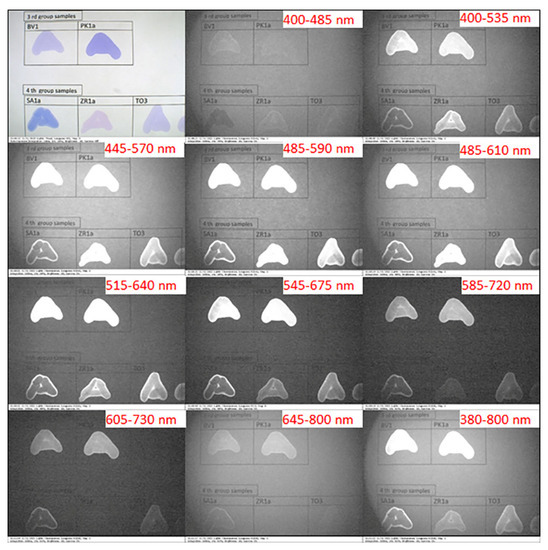 Group I comprises 12 luminescent ink samples exhibiting a vivid white coloration, namely RO4, RO7, RO8, TO1, TO2, PG1, RX1, RX2, CL2, EU1, PE1, and ST1a. Notably, all of these 12 samples maintain their luminescent activity when subjected to examination with the remaining optical filters, as well as the complete spectrum, as depicted in Figure 1. Even though little variations in luminescence strength exist due to some variations in the tone of the color between samples, ranging between a blurring white to off-white and gray color, all such samples were considered as having luminescence activity in our classification [16].