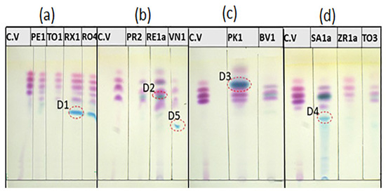 The TLC analysis was conducted using 5 cm × 7.5 cm aluminum sheets coated with silica gel (60F-254, Merck, Darmstadt, Germany). From the above-mentioned samples of Groups I–IV, 12 samples were sub-selected for ink dissolution and analysis. The prepared solvated ink solutions along with a solution of the standard relevant dye were analyzed using TLC to determine the dyes present in each sample. The mobile phase employed for this analysis consisted of a mixture of n-butanol, ethanol, and water in a ratio of 5:1:1.5, as described in the literature [17,24,25]. The TLC bands were labeled as D1–D5 based on their respective Rf values. The standard crystal violet dye was also added to those bands.