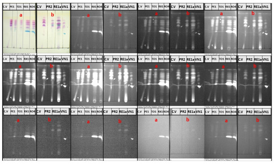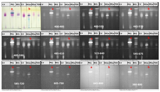 IRL of TLC plates of samples of (a) subgroup I and (b) subgroup II under white light and different preset optical excitation filters.