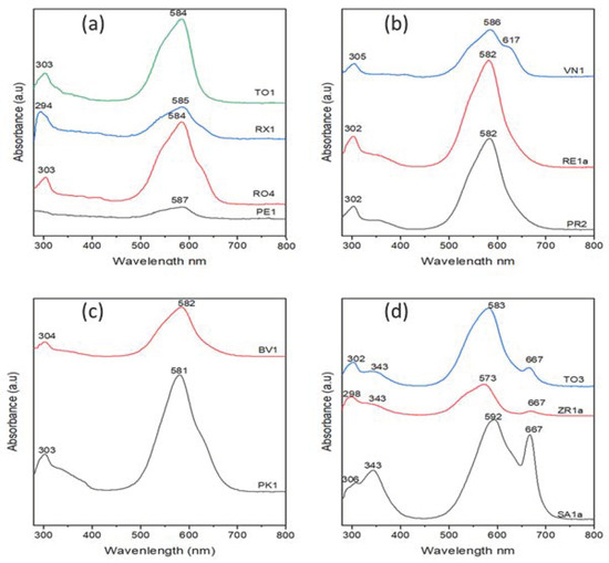 UV–Vis spectra of solutions of the solvated ink samples of (a) subgroup I, (b) subgroup II, (c) subgroup III, and (d) subgroup IV.