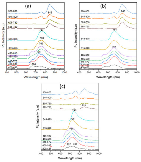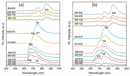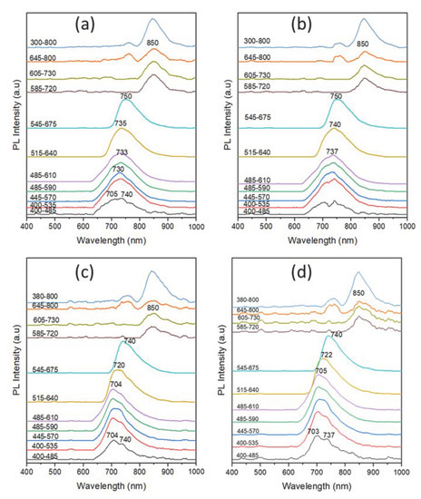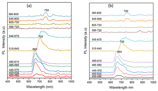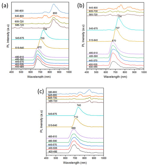 Figure 13 displays the PL spectra of the ink strokes of the writing BP pens of subgroup III, namely PK1 and BV1 pens under excitation of the ten different preset optical filters of the VSC. The spectra indicate that both the PK1 and BV1 samples express weak PL under the excitation of the first (400–485 nm) band-pass filter in an alignment with their faint dark appearance as discussed in the IRL images shown above in Figure 3. When the ink stroke samples were excited using the second excitation band-pass filters, the PK1 featured emission peaks centered around 666 nm and 732 nm, while BV1 showed emission bands with maxima at 670 nm and 742 nm, as can be seen in Figure 13a,b. Upon excitation with band-pass filters of longer wavelength, the PK1 sample expressed relatively higher PL intensity at around 666 nm, compared to 742 nm in the case of the BV1. The different PL characteristics of these two samples match well with different dye compositions as indicated by the TLC results shown in Figure 7c. When both samples were excited using the seventh excitation band-pass filter, a red shift of the emission maxima to 745 nm and 765 nm was observed for the PK1 and BV1, respectively. Under the excitation, using the eighth-to-tenth filters, both Pk1 and BV1 samples possess a weak PL with an emission maximum centered around 845 nm. The weak PL under these excitation filters agrees with the weak IRL observed using the same filters as discussed earlier in Figure 3.
