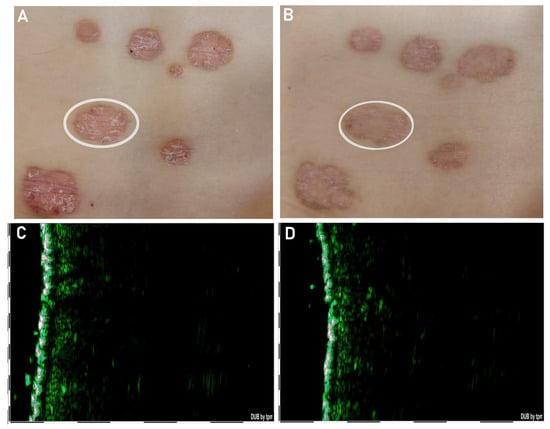 Psoriatic skin before the therapy (A) and the ultrasound image corresponding to the lesion marked in the photograph (C). Psoriatic skin after 20 irradiations (B) and the ultrasound image corresponding to the lesion marked (white circle) in the photograph (D).